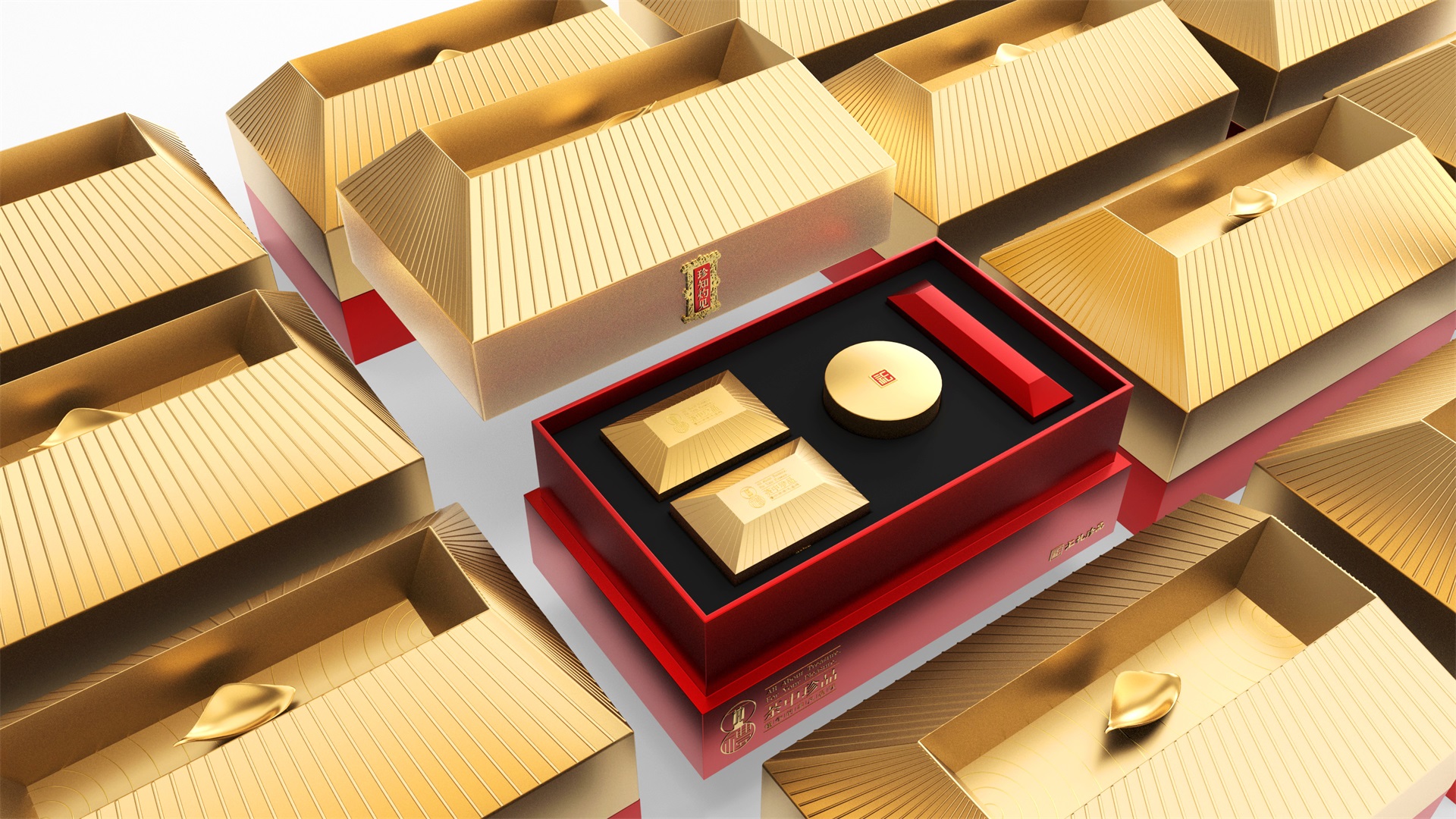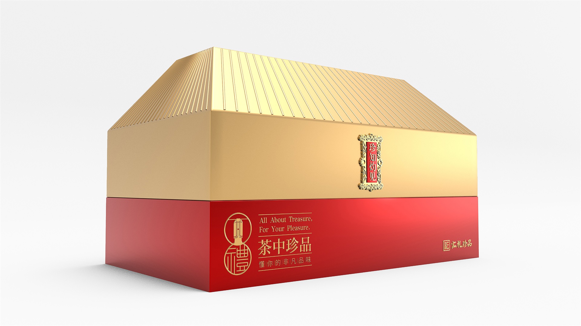汇礼珍品包装设计,基于产品品级为茶中王者级别,J9九游国际站所以包装整体造型采用中国古代地位的皇家元素:宫殿为设计灵感进行设计,包装上盖为金色宫殿屋檐造型,斜面上也装饰了代表瓦片的条纹,上盖中部内陷,底部使用水纹铺底,在水纹上飘着一片金色的茶叶,高山流水觅知音,在一个上盖营造出了基于高端气质上,茶道与人道相融的意境画面;在上盖的正面中部,使用宫殿匾额形式作为展示包装的品类名称,将包装的宫殿造型进一步完善。支撑金色宫殿下方的红色地台作为包装下部,在正面放置文字信息和品牌标志。整体采用天地盖的形式,使开盖具备仪式感。内部分包装与外部形式大体相同,但有所以简略,保证整体性的同时也保证整体包装不会过于繁复,保持平衡。